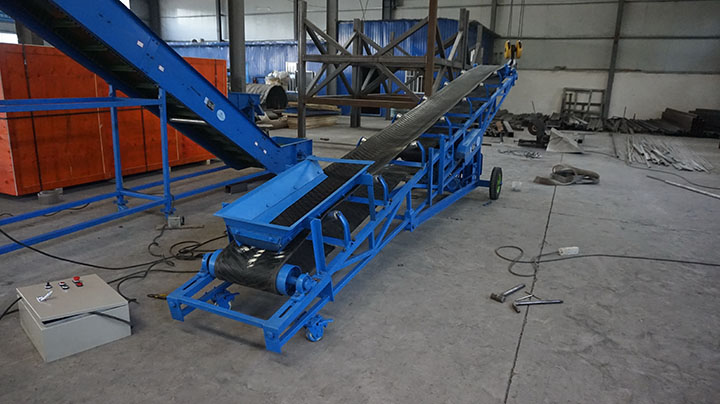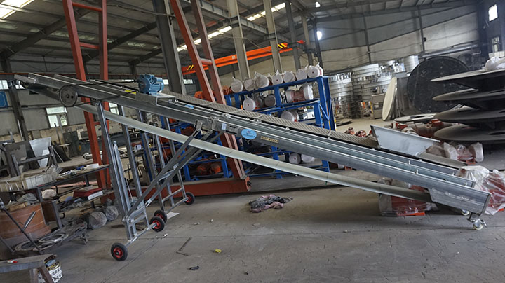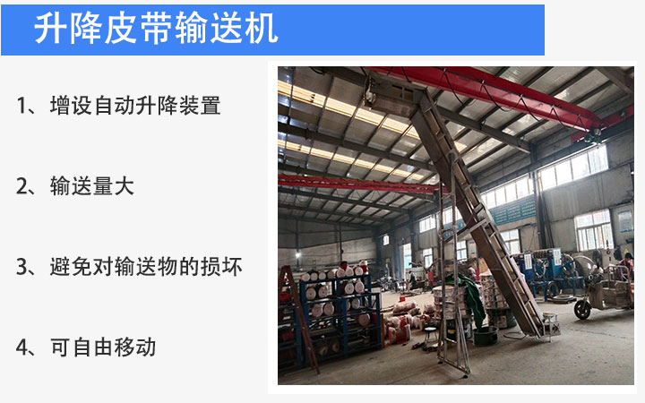 升降皮帶輸送機(jī)即移動(dòng)液壓升降式皮帶輸送機(jī),增設(shè)自動(dòng)升降裝置,可以自由調(diào)整高度,適用于散狀物料或成件物品的短途輸送和裝卸工作,并配有充氣輪胎和鋼輪兩種行走輪,機(jī)長(zhǎng)10米以上傾角可調(diào)。